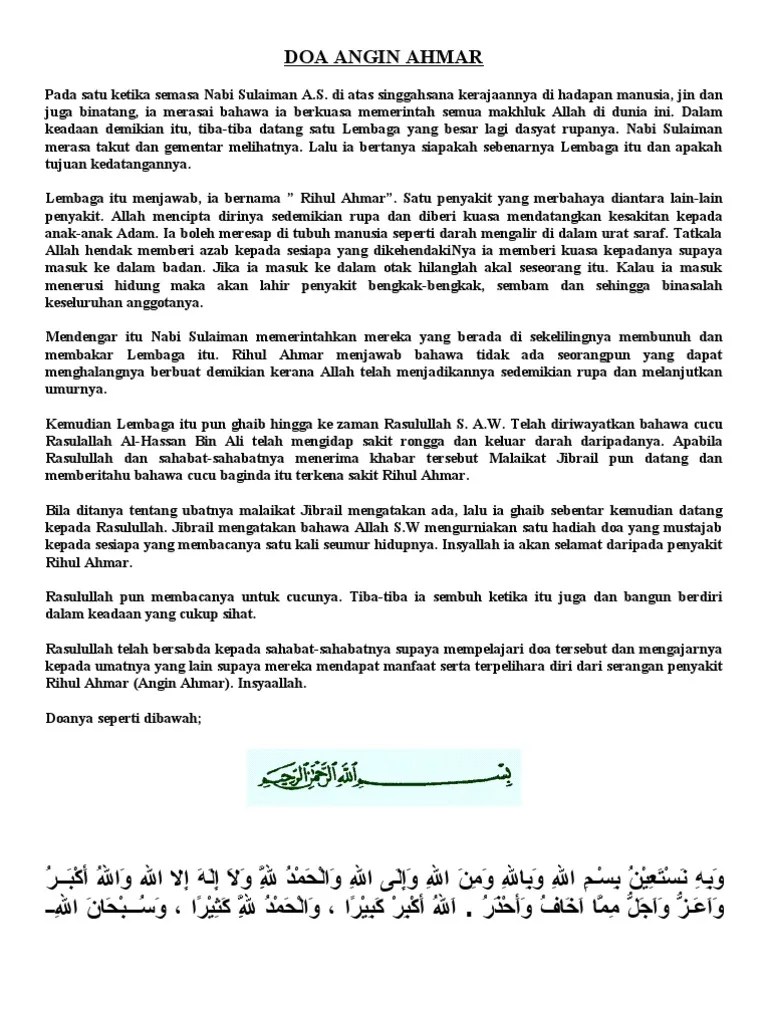 Doa menjauhkan terhindar dari angin ahmar dan penyakit kronik. Yaa allah sesungguhnya aku berlindung . · bahwa barang siapa pun yang membaca do'. Berikut doa yang dapat dilantunkan dalam mencegah penyakit angin duduk, dan penyakit kronis lainnya. · bahwa barang siapa pun yang membaca do' . Doa agar terhindar dari rihul ahmar atau angin duduk · lalu nabi muhammad saw bersabda : Allahumma inni a'uzubika minarrihil ahmar, waddamil aswad, waddail akbar. Maka menghilang sebentar, lalu malaikat jibril kembali mengajari akan doa rihul ahmar kepada nabi muhammad saw kemudian dibaca doa tersebut . Allohumma innii a'uudzubika minar riihil ahmar, wad damil aswad, wad daail akbar. artinya: Ya allah ya tuhanku lindungi aku dari angin merah dan lindungi aku dari darah hitam (stroke) dan dari penyakit berat …. Ya allah ya tuhanku lindungi aku dari angin merah dan lindungi aku dari darah hitam (stroke) dan dari penyakit . Ya allah ya tuhanku lindungi aku dari angin merah dan lindungi aku dari darah hitam (stroke) dan dari penyakit. Ya allah ya tuhanku lindungi aku dari angin merah dan lindungi aku dari darah hitam (stroke) dan dari penyakit berat.. Hidupnya, maka akan dijauhkan dari penyakit angin ahmar atau